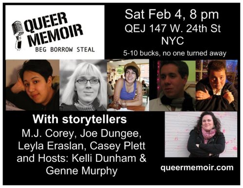 For our February event, Genne Murphy will be returning! Queer Memoir is New York’s only queer storytelling event. Let us know how many chairs to put out; RSVP on facebook.